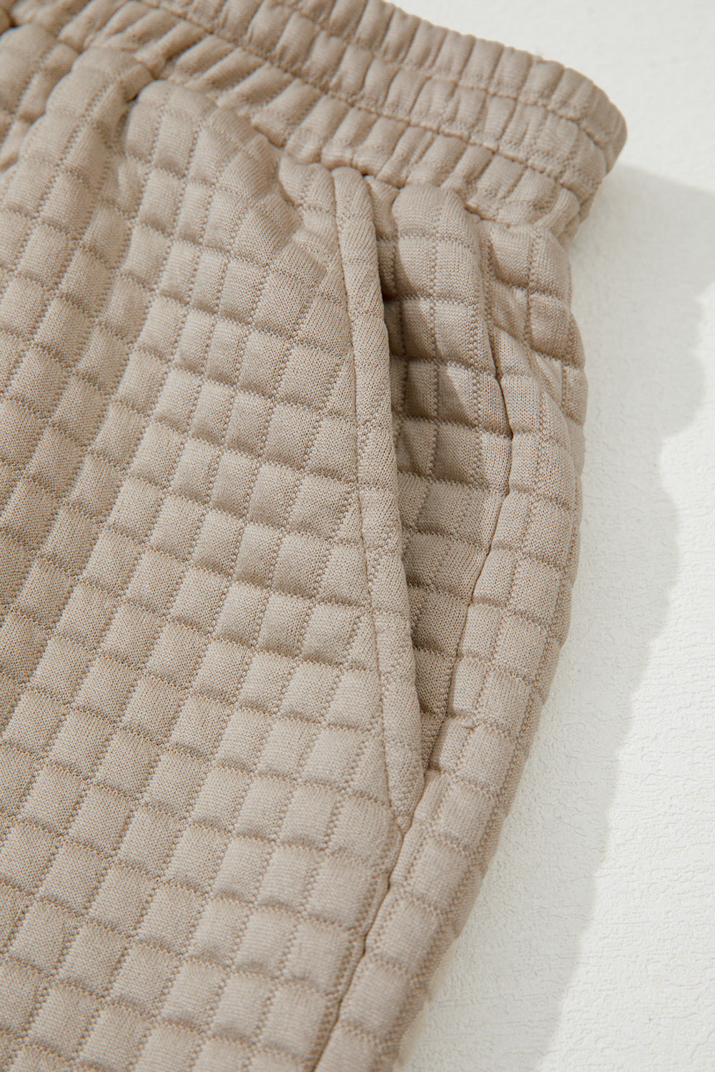 Khaki Color Block Patchwork Textured Long Sleeve Top 2pcs Short Set