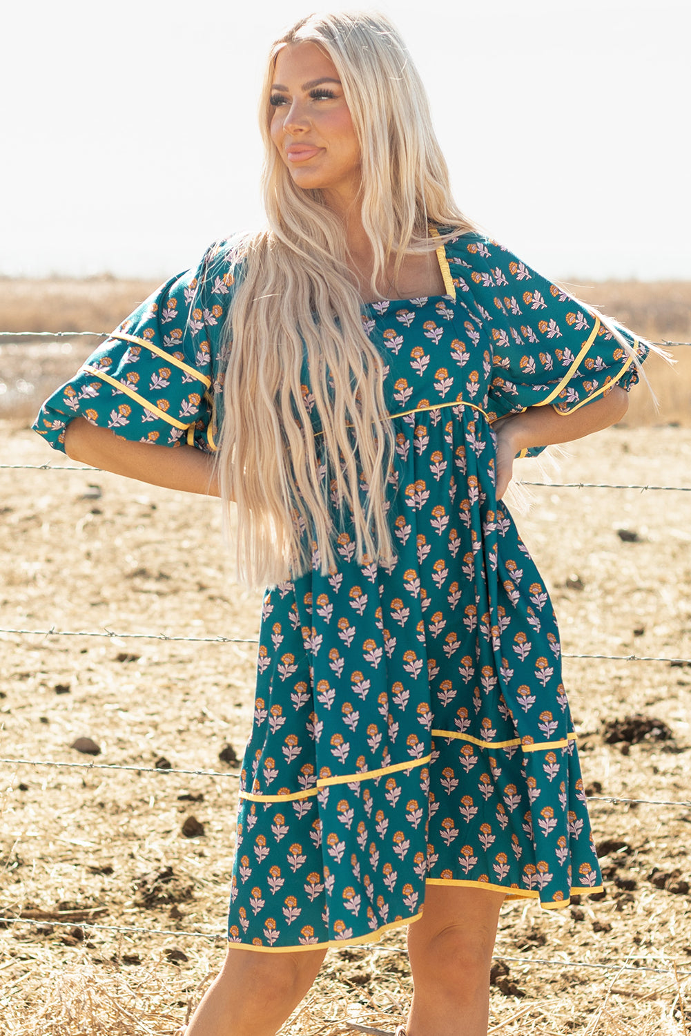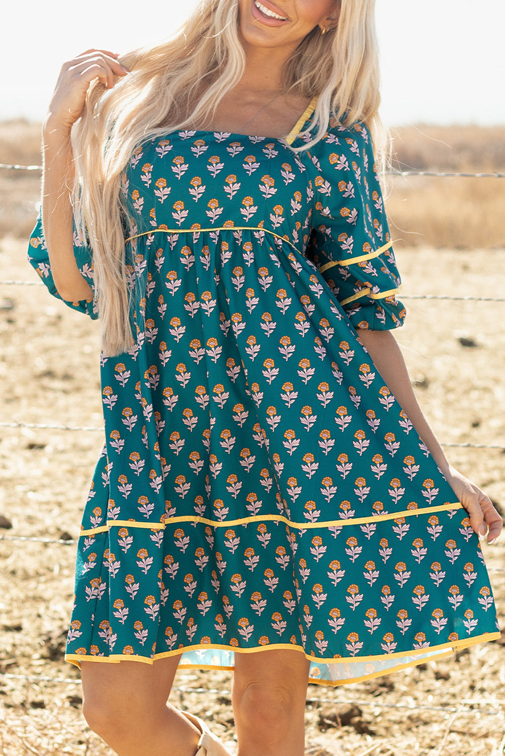 Skobeloff Floral Contrast Trim Square Neck Puff Sleeve Dress